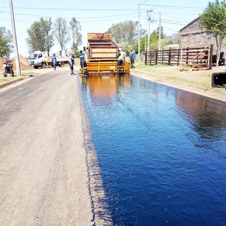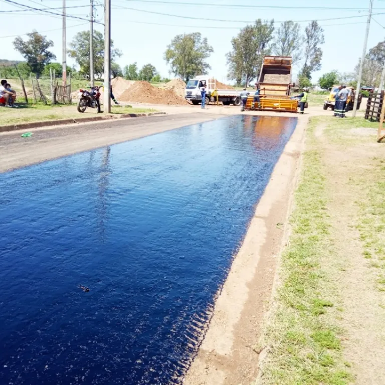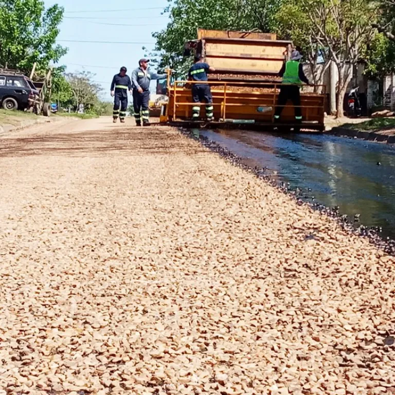 En barrio Don Atilio continúan los trabajos a cargo del equipo del Departamento de Obras de la Intendencia de Salto con la imprimación del material y la colocación de piedra 3, primera etapa de la bituminización de las calles de este barrio donde hacía varios años no se realizaba una intervención de esta magnitud..