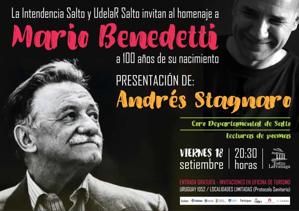 La Intendencia de Salto y el Cenur Litoral Norte invitan a la velada en homenaje a Mario Benedetti, en los cien años de su nacimiento. Como invitado especial estará el reconocido cantautor salteño Andrés Stagnaro, habrá lecturas de poemas a cargo de Evangelina Cavalho, integrante del grupo teatral La Galera, y Claudia Córdoba, y la actuación del Coro Departamental de Salto..