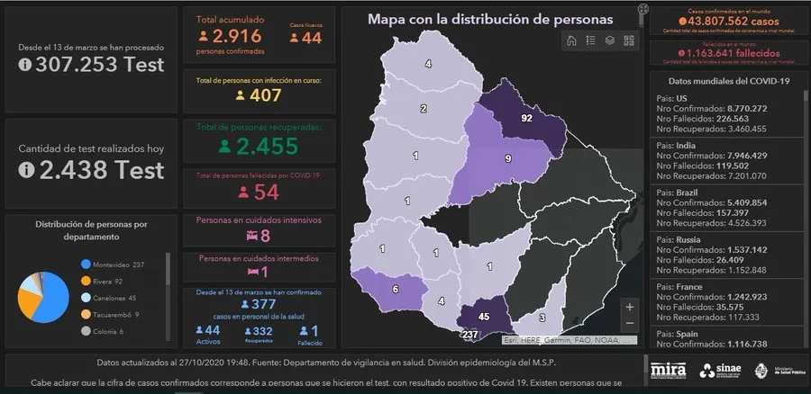 Desde que se declaró la emergencia sanitaria el 13 de marzo se han procesado 307.253 tests y se han registrado 2916 casos positivos de Coronavirus en todo el territorio nacional. De ese total 2455 ya se recuperaron y 54 fallecieron.