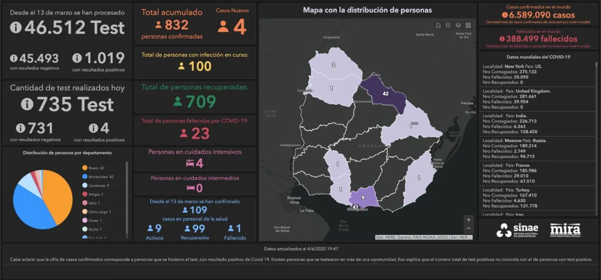 INFORME JUEVES 4 DE JUNIO: VAN 832 CASOS POSITIVOS DE CORONAVIRUS EN URUGUAY