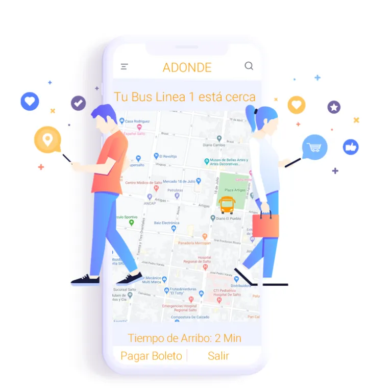 Además de novedosa, la aplicación denominada: ADONDE? contará entre sus funcionalidades un sistema de información al usuario sobre la ubicación en tiempo real del bus en el mapa de Salto, el tiempo estimado del arribo del mismo a la parada en la que se encuentra el usuario y conocer el recorrido de las líneas de transporte.