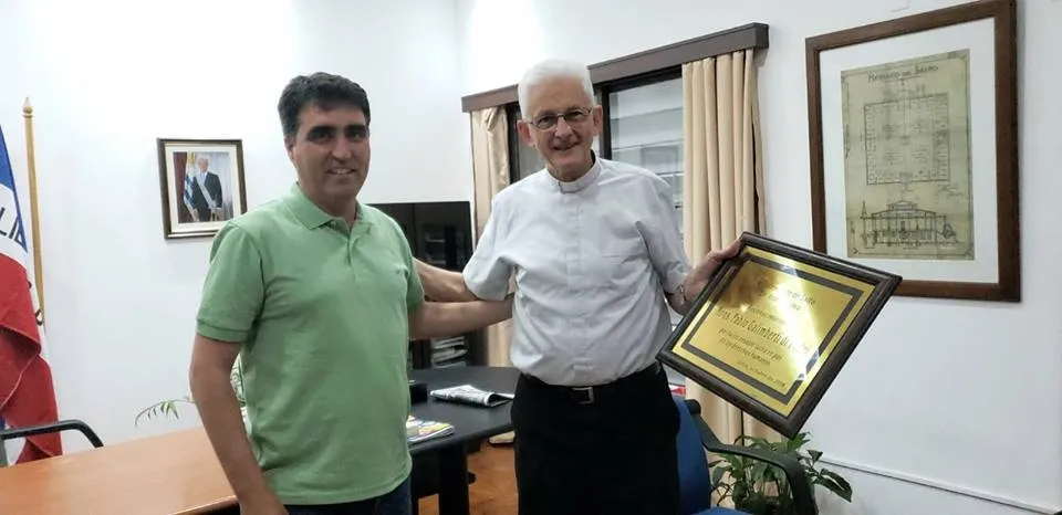 El intendente de Salto Andrés Lima hizo entrega de un reconocimiento al exobispo de Salto, monseñor Pablo Galimberti, por su lucha en pos de los derechos humanos y su dedicación a la comunidad salteña durante todos los años que estuvo al frente de la Diócesis de Salto..