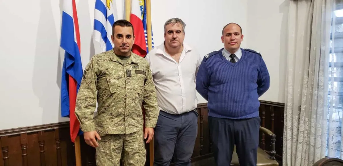 . . Recién asumido como jefe de los aeropuertos de Salto y Paysandú estuvo en la Intendencia el teniente primero Carlos García Martínez junto al sargento primero Julio Acosta (servicios generales), reunidos con el secretario general Lic. Fabián Bochia..
