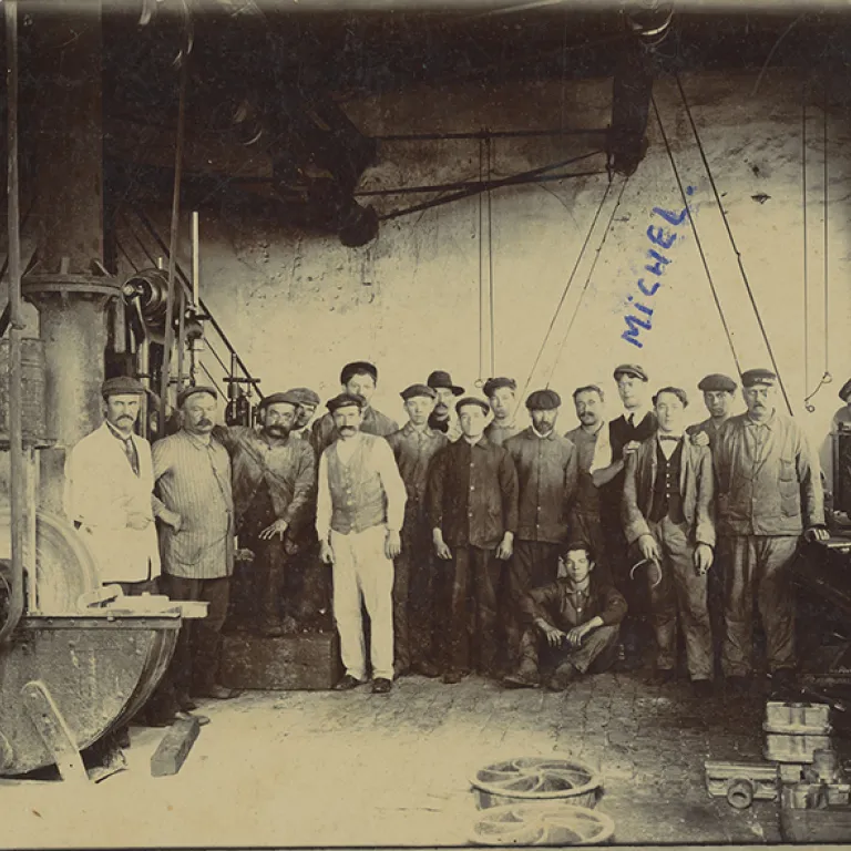 - Fotografía presentada por Jorge Potter. La foto muestra un grupo de obreros en los talleres del ferrocarril noroeste de la ciudad de Salto, donde se construyó la locomotora la Criollo, primera máquina a vapor construida en Sudamérica, en el año 1895.