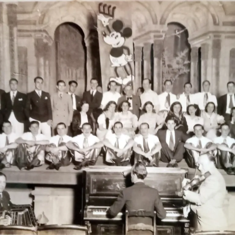 -Fotografía presentada por Claudia Córdoba. En la foto se aprecia una actuación artística. Es el grupo de liceo Ipoll donde concurría la abuela materna de Claudia, Alcira Gaudín Regueira. Obra en Teatro Larrañaga. Año aproximado 1930.