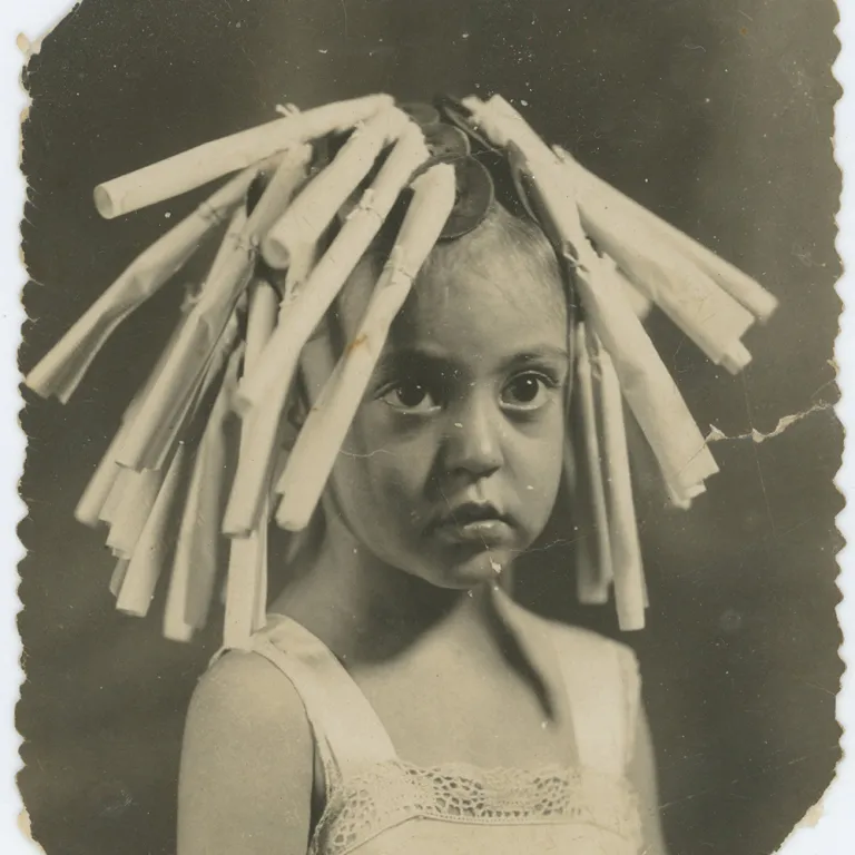 - Fotografía presentada por Nelly Sabajou. La imagen muestra a Nelly de niña, realizándose rizos o bucles en el cabello.
