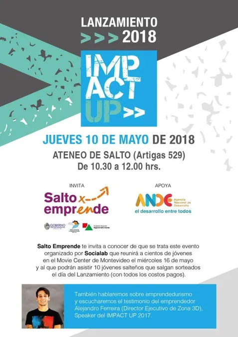 Salto Emprende estará realizando el Lanzamiento del IMPACT UP 2018 este jueves 10 de mayo en el Ateneo de Salto, entre las 10.30 y las 12.00 hrs. mediante un encuentro dirigido a jóvenes de entre 16 y 21 años. "El IMPACT UP es un evento para jóvenes, una instancia para inspirarse con la historia de otros jóvenes que están trabajando con sus emprendimientos por una sociedad más justa, generando un impacto positivo", señaló la Cra. Angelina Bazzano. "Este evento es organizado en Montevideo por Socialab, una asociación civil sin fines de lucro que busca mejorar la calidad de vida de las personas en vulnerabilidad a nivel global, mediante la búsqueda y el apoyo a emprendimientos sociales innovadores y sostenibles que se encuentran en etapa temprana. Socialab realizará el IMPACT UP de este año el miércoles 16 de mayo, entre las 8.30 y las 12.30 hrs. en el Teatro Movie de Montevideo Shopping, y a través de Salto Emprende estaremos haciendo posible que 10 jóvenes salteños puedan participar del mismo con todos los gastos pagos de traslados y comidas", agregó..