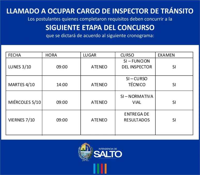 La Intendencia de Salto, convoca a los postulantes a ocupar cargo de Inspectores de Tránsito que cumplieron los requisitos solicitados, y que aún no se hayan presentado, a que concurran este jueves 6 de octubre a la hora 9 al Ateneo de Salto. Será la última oportunidad.