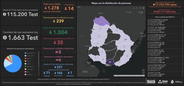 De acuerdo a la información proporcionada por el Ministerio de Salud Pública (MSP), en la jornada de hoy se llevaron a cabo 1663 análisis y se detectaron 14 casos positivos nuevos de Coronavirus COVID-19, 6 de ellos son de Montevideo, 4 de Canelones, 2 de Cerro Largo, 1 de Maldonado y 1 de Rivera. De los 14 casos nuevos, 7 corresponden a brotes originados en centros de salud. En todos los casos ya están identificados los contactos y se mantiene un estricto seguimiento epidemiológico. Actualmente hay 239 casos activos, es decir personas que están cursando la enfermedad, 5 de ellas se encuentran en cuidados intensivos y ninguna en cuidados intermedios..