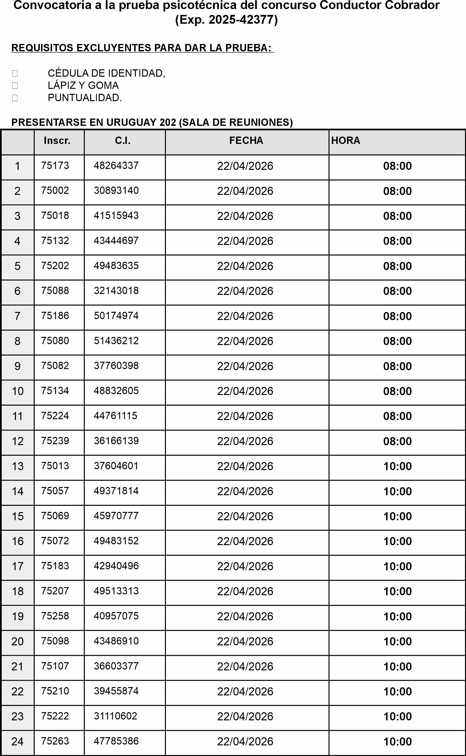 Se convoca para la prueba psicotécnica en el marco del concurso para conductor cobrador de la División Ómnibus del Departamento de Movilidad Urbana.
