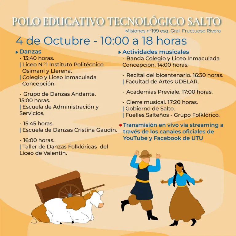 DÍA DEL PATRIMONIO: BICENTENARIO EN UTU 4 de octubre de 10 a 18 horas Danzas y actividades musicales. Transmisión en vivo vía streaming a través de los canales oficiales de YouTube y Facebook de UTU.