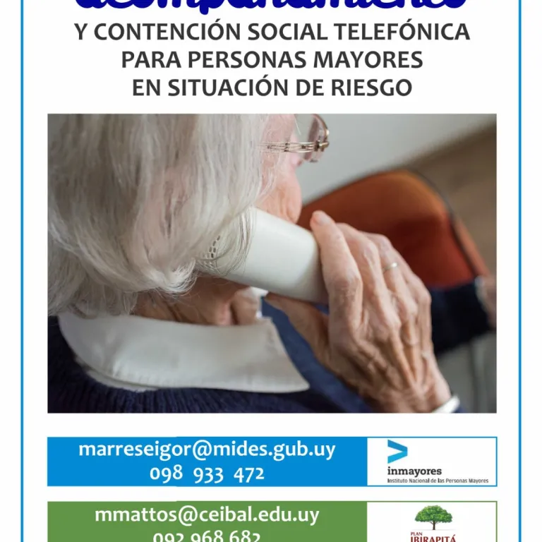 . Dada la situación de emergencia sanitaria, un conjunto de instituciones públicas crearon un servicio de acompañamiento telefónico y contención social para personas mayores que se encuentran solas y con riesgos sociales.. El servicio se orienta a brindar un soporte emocional a aquellas personas no están contempladas en las líneas telefónicas que ya ofrece el Estado y que no están atendidas por ninguna institución pública. Comprende varias líneas de teléfono así como correos electrónicos para poder derivar situaciones detectadas.El servicio es brindado por el Instituto Inmayores, el BPS y el Plan Ibirapitá, y en Salto cuenta con el apoyo de la unidad de Género y Generaciones de la Intendencia..