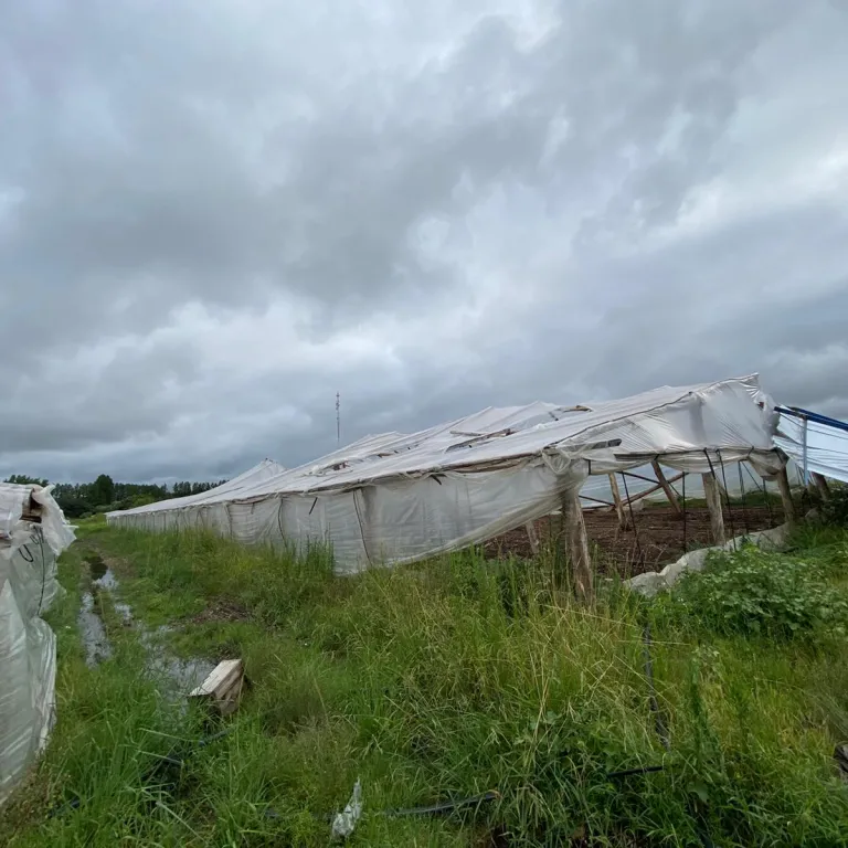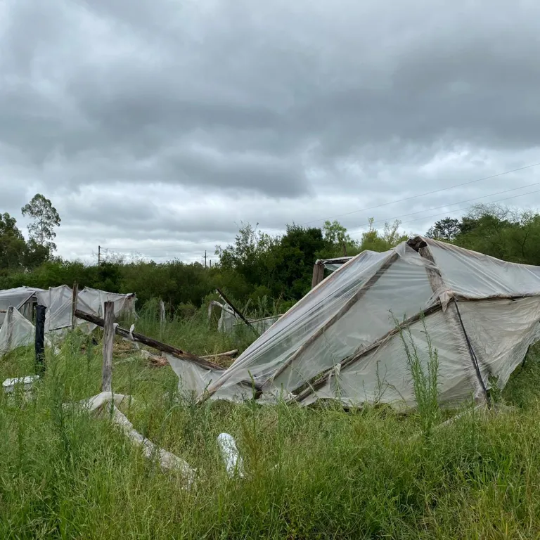 En la tarde de este sábado el fuerte temporal provocó daños en la zona de chacras de Villa Constitución. Se constataron daños tanto en estructura como en nylon, en invernáculos, algunos de ellos en plena producción..