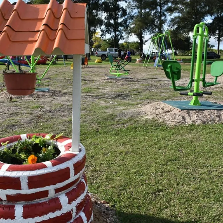 La nueva plaza cuenta con cinco juegos saludables, tres inclusivos y tres infantiles; además, funcionarios de Servicios Públicos de la Intendencia construyeron mesas y asientos de hormigón, instalaron columnas de alumbrado público con luces led y cambiaron los arcos de fútbol de la cancha lindera a este nuevo espacio que está ubicado frente al cementerio del pueblo.
