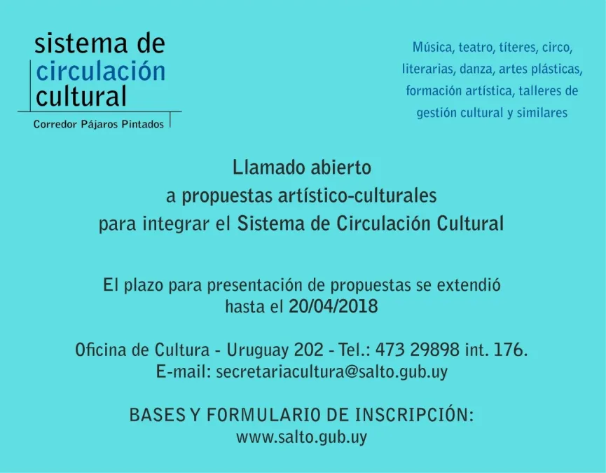 Por consultas tel. 473 29898 int. 176. o a través del e-mail: secretariacultura@salto.gub.uy