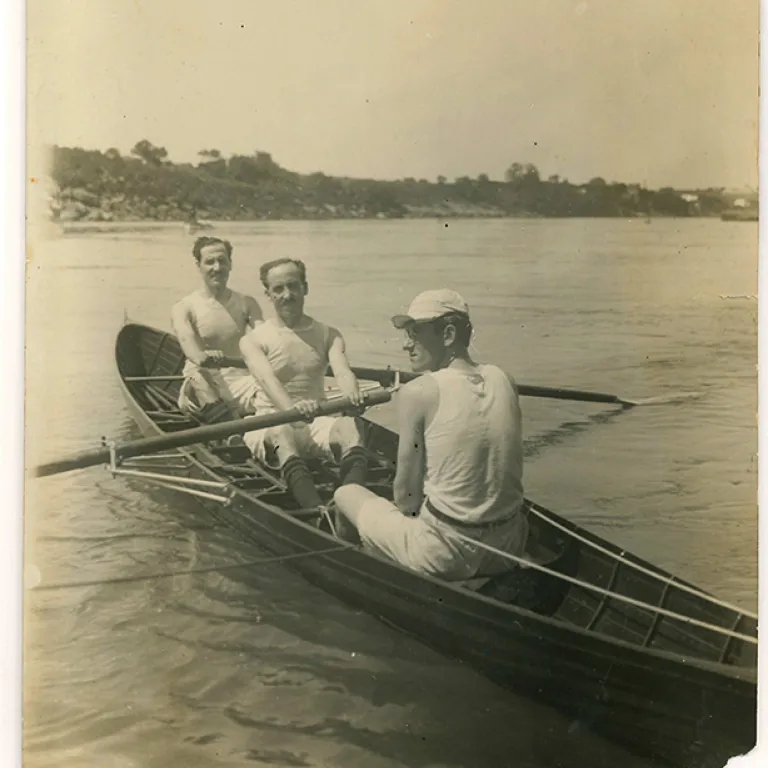 - Fotografía presentada por Mariana Ferreira. Foto de 1930 en el Río Uruguay. Jorge y Miguel Azuri, remeros. Emilio Minatta, timonel.