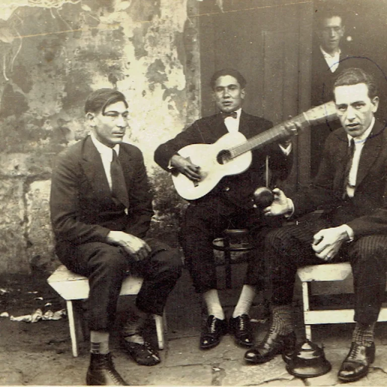 - Fotografía presentada por José Luis del Río. En la foto está su abuelo, Nicolás Romano, en una guitarreada. Romano es el que está con el mate estilo galleta en la mano.